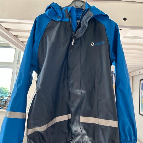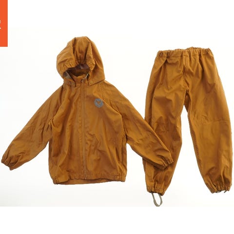 Regnsæt til børn bestående af en jakke med hætte og bukser. Jakken har lynlås foran, og bukserne er med elastik i taljen og benene, samt lommer. Sættet er ensfarvet rødt.