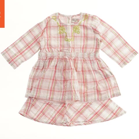 Langærmet kjole i lyserød med et detaljeret dyremønster. Kjolen har en rund halsudskæring og samling i taljen, hvilket giver en let A-form.