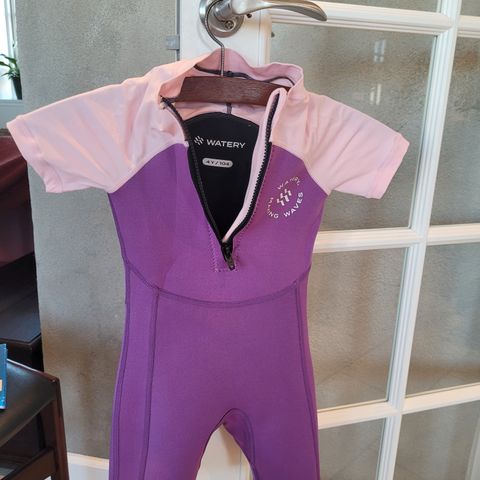 Sort våddragt med korte ærmer. Der er et logo på brystet og et Rip Curl-mærke på ryggen. Dragten har en høj hals og er designet til vandaktiviteter.