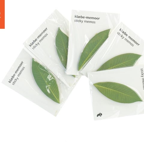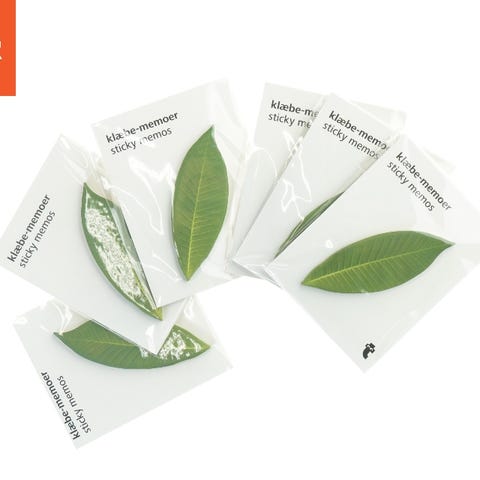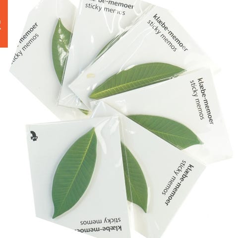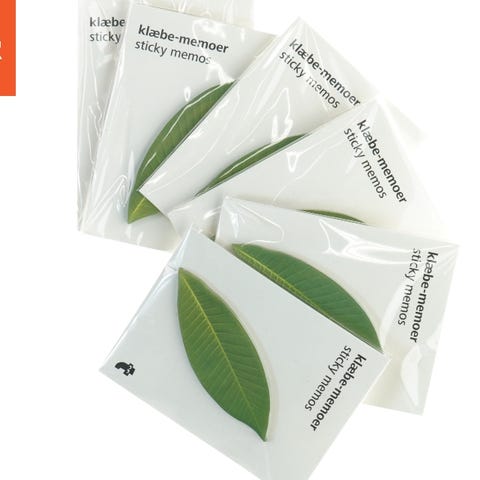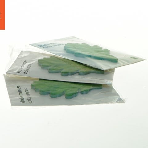 Seks pakker post-it notes (også kaldet sticky-notes eller klæbe-memoer) designet som grønne blade. Hver pakke indeholder en blok med mange kraftige selvklæbende ark, hvert udformet som et blad.