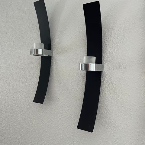 To sorte, vægmonterede spotlamper fra Herstal med indbygget omskifter og fleksible arme, så lyset kan peges i ønskede retninger. Lampeskærmene har hvid inderside og en sort højglans yderside. Ledningerne er sorte med strømstik. Sættet er komplet og klar til montering. Hver lampe måler 28x11 cm.