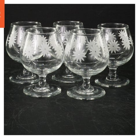 Sæt af seks glas til congnac, whisky eller dessetglas prydet med et indgraveret blomstermønster. Glassene har en bred, afrundet form og en stabil fod. Fin gave til såvel til den unge nye indflytter eller ældre samlere.
