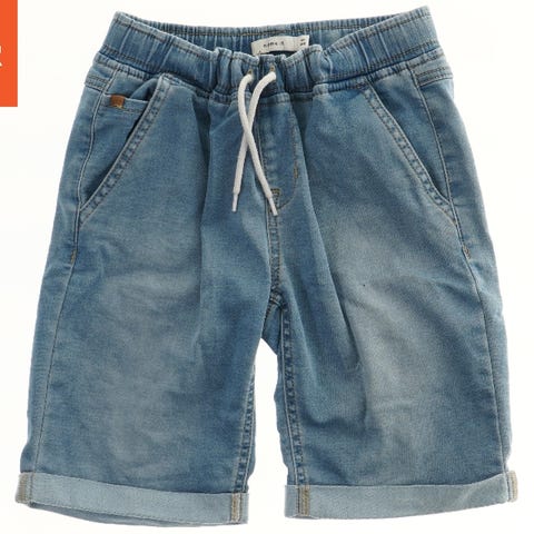 Blå denim shorts med mønster og blondekanter nederst. Shortsene har lommer foran og bagpå samt bæltestropper.