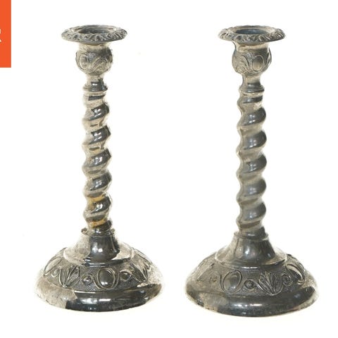 To antikke lysestager fremstillet af sølvplet med en klassisk og elegant design. Hver stage har rummelig plads til tre stearinlys, og det snoede design tilføjer en kunstnerisk touch. De er perfekte til at skabe en hyggelig atmosfære i hjemmet og kan bruges som dekorative elementer på borde eller hylder.