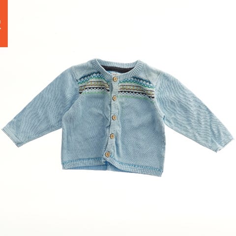 Lyserød cardigan med knapper foran. Den har små hulmønster detaljer og elastiske kanter. Designet til nyfødte.
