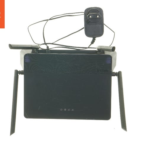 D-Link WiFi-router med fire antenner og strømforsyning. Routeren har en størrelse på 26x18,5 cm og indeholder flere netværkstilslutninger. Model DIR-878, som står skrevet på undersiden.