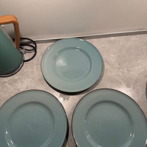Dette er et sæt af flade tallerkener med en diameter på 25,6 cm. Tallerkenerne har en gråblå farvetone med en marmoreret struktur. De er velegnede til servering af måltider og har en elegant og moderne stil. Der ses et mærke eller logo på undersiden af tallerkenerne.