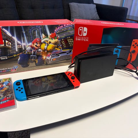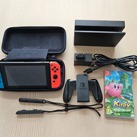Nintendo Switch konsol med neon rød og blå Joy-Con controllere. Konsollen kan bruges både som håndholdt enhed og tilsluttes tv via den medfølgende dock (fremgår af billederne). Der medfølger en rigtig fin transporttaske, Joy-Con holder og flere fysiske spil som ses på billederne. Der medfølger også strømstik og hdmi kabel. Der er desuden sat et beskyttelsesglas på skærmen. Joy-Con controllere er brugte men virker perfekt (kan ses på billederne)