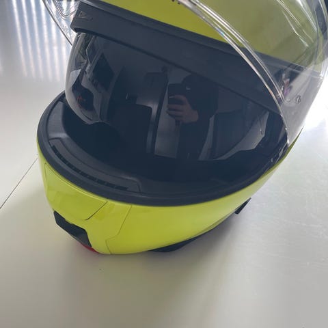 Schuberth C4 Pro motorcykelhjelm i gul/sort. Integralhjelm med klart visir og indbygget ventilation i toppen. Polstret inderfor med hage- og nakkestrop samt kliklås. Hjelmen har integrerede betjeningsknapper i siden, der er forberedt til kommunikationssystem. Velegnet til brug på motorcykel og scooter.
