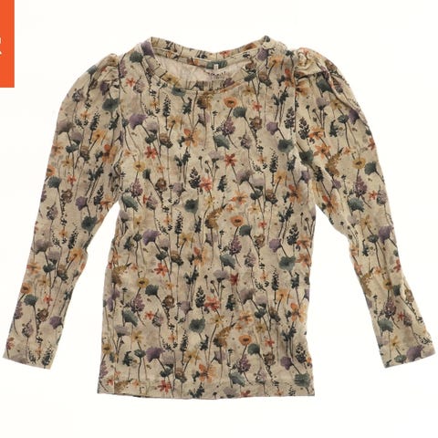 En langærmet bluse i orange farve. Blusen har en rund halsudskæring og er lavet af et materiale med et let mønster. Velegnet til hverdagsbrug eller som en del af et lag-på-lag outfit.