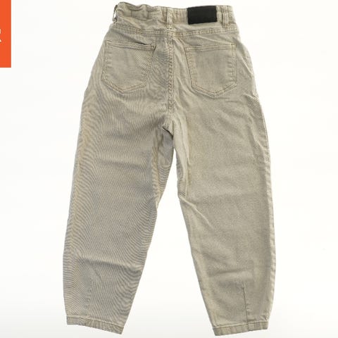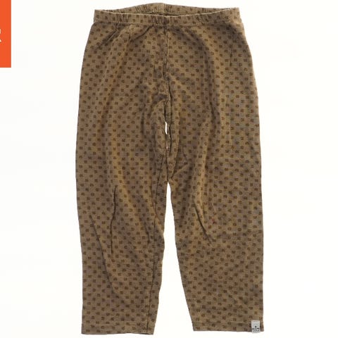 Lyse bukser med elastisk talje og et all-over print af små, mørke mønstre. Designet er enkelt og komfortabelt, velegnet til afslappet brug.