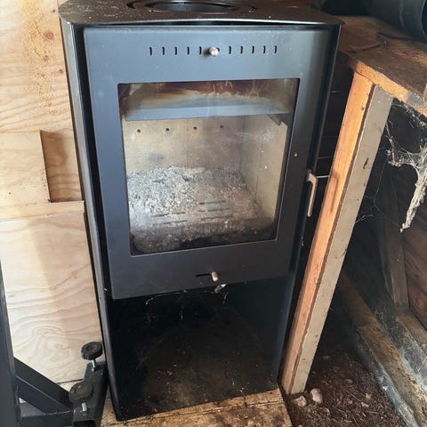 Fritstående brændeovn med glaslåge på fronten og røgafgang i toppen. Ovnen har reguleringsgreb på fronten til styring af lufttilførsel samt håndtag til åbning af lågen. Under brændkammeret er der et lille opbevarings- eller askerum. Velegnet som varmekilde i mindre rum, sommerhus eller værksted, hvor der er mulighed for korrekt tilslutning til skorsten. Komplet med afgangsrør, skorsten og røgvender.