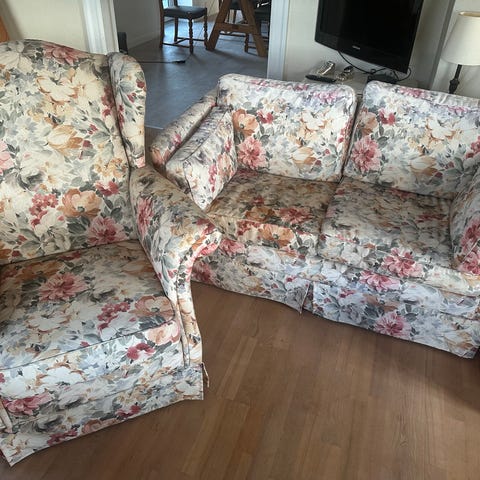Flot bamsestol og sofa i fin gul farve. Brugt i sommerhus. Man sidder godt i dem.