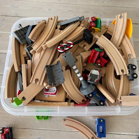 Blandet alder og stand. +100 togskinner mv. +30 togvogne mv. Der er nogle elektriske tog med. Jeg har ikke testet om de stadig virker (1 har virket mens vi har brugt det. 1 har delvist virket. 1 har jeg ikke opdaget var med batterier, men det er det gamle så tror ikke det virker). Thomas tog og Percy. Flere forskellige længder og kurver, herunder skiftespor og broer, samt flere tog, vogne og tilbehørsdele som vejoverkørsel, skilte og træer.