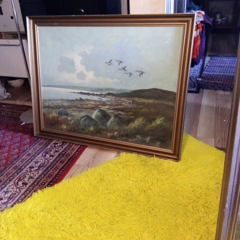 Maleri landskab med hjorte i efterårsskov med guldramme