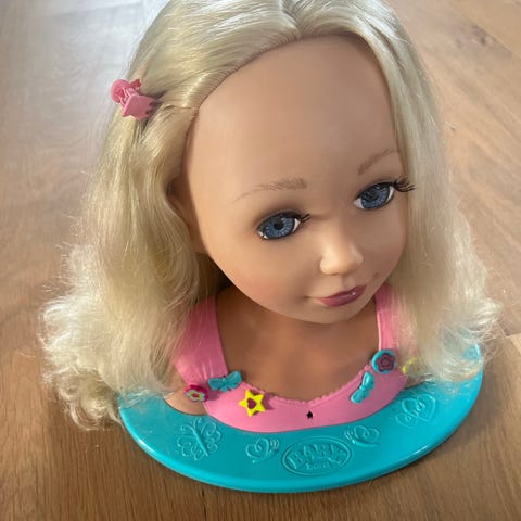 Frisørdukke til styling, inkluderer en hårbørste, hårtørrer, spejl og en taske med forskellige håraccessories som elastikker, clips og pynt. Perfekt til børn, der elsker at eksperimentere med forskellige frisurer. Dukken står på en rund base og har langt blondt hår.