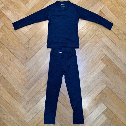 2 stk ZigZag Halland skiundertøjssæt til børn. Sættet består af langærmet trøje og lange underbukser i mørkeblå uldblanding (Merino uld). Designet som basislag til brug under overtøj ved udendørs aktiviteter og vinterbrug.