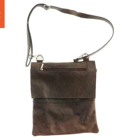Blå skuldertaske med en brun strop. Tasken har en størrelse på 24x35 cm, en justerbar skulderrem og en frontklap med en enkelt knaplukning. På bagsiden af tasken er der en lynlåslomme for ekstra opbevaring.