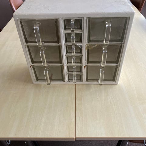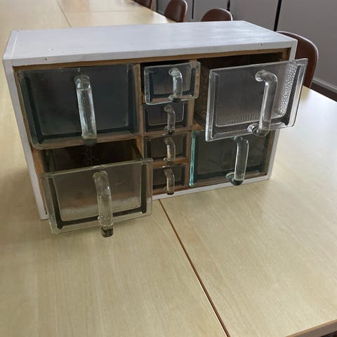 Vintage IKEA vægskab / krydderiskab med originale glasskuffer.