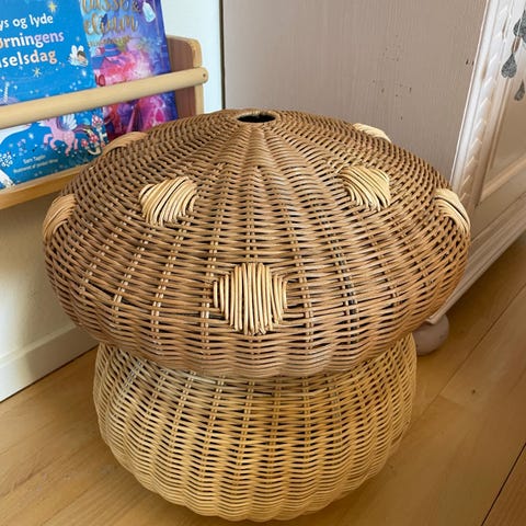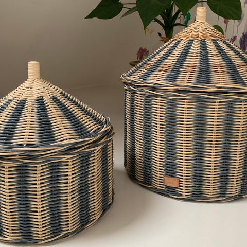 OYOY kurvesæt opbevaringskurve med låg i flettet materiale i natur- og mørke nuancer. Sættet består af to runde kurve i forskellige størrelser, der kan stables i hinanden. Kurvene har aftagelige låg med kegleformet top og stribet mønster, som går igen på sider og bund. Velegnet til opbevaring af legetøj, tøj eller andre mindre genstande på børneværelse eller i andre rum i hjemmet.
