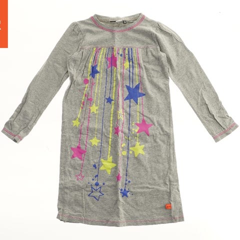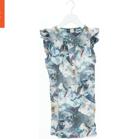 En ærmeløs kjole med et farverigt mønstertrykt design. Kjolen har et sort bånd omkring taljen. Den lukkes med en lynlås i ryggen.