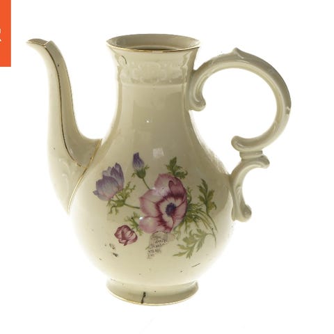 En keramikkande med en diameter på 9,5 cm og en længde på 14 cm. Kanden har et blomstermønster der minder om Syberg Keramik, med farverige blomster og bladmotiver, malet på en cremefarvet baggrund. Den har en solid hank og en udløbstud. finntil den varme mælk. Kanden har en dekoration langs kanten i gule og brune nuancer.