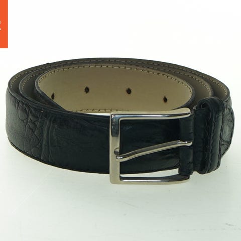 Dette er et bælte lavet af sort læder med et spænde i metal. Det måler 84,5 cm i længden og har et minimalistisk design. Spændet er rektangulært med graverede tal, der giver det et unikt look.