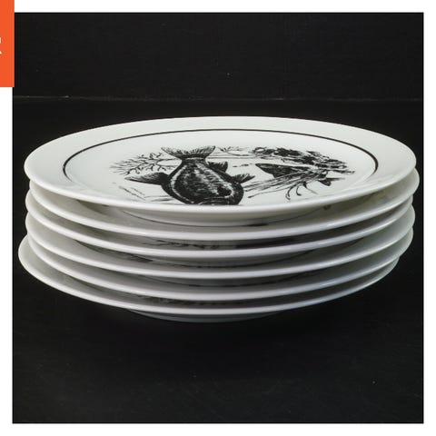 Dette er et sæt af fem porcelænstallerkener, hver med et unikt fiskeprint og naturmotiv. Tallerkenerne har en diameter på 19 cm og er dekoreret med billeder af forskellige fiskearter omgivet af akvatiske planter. De har en fin guldkant, hvilket giver dem en elegant finish.