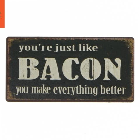 Dette er et lille skilt, der måler 10x5 cm. Skiltet har teksten 'you're just like BACON you make everything better' skrevet på forsiden. Bagsiden viser et mærkat med LaFinesse.eu og en stregkode. Skiltet har en aldrende look med let slitage og mørke kanter.