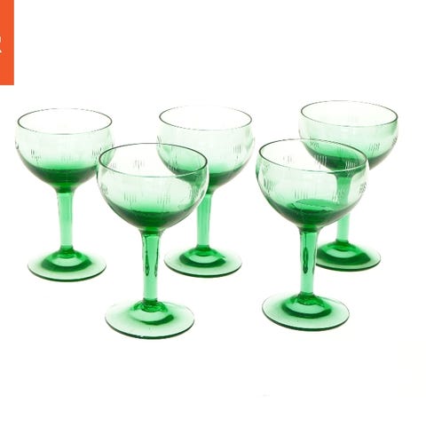 Seks grønne cocktailglas med en diameter på 7,5 cm og en højde på 12 cm. Designet er enkelt med en elegant form, perfekt til servering af forskellige drikkevarer.