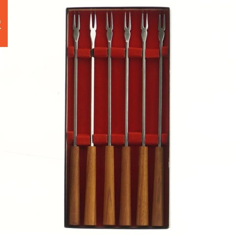 Sæt bestående af 6 fondue gafler lavet af rustfrit stål med træhåndtag. Hver gaffel er 26,5 cm lang og har en farvet ende for at identificere brugeren. Sættet kommer i original emballage.
