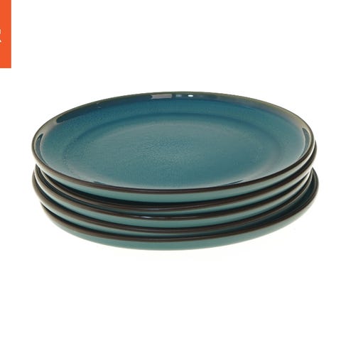Rund tallerken med en diameter på 24 cm. Tallerkenen har et mønster langs kanten med blå og grå dråbeformede elementer. Bagsiden af tallerkenen viser en mærkat med et logo, der indikerer fabrikanten.