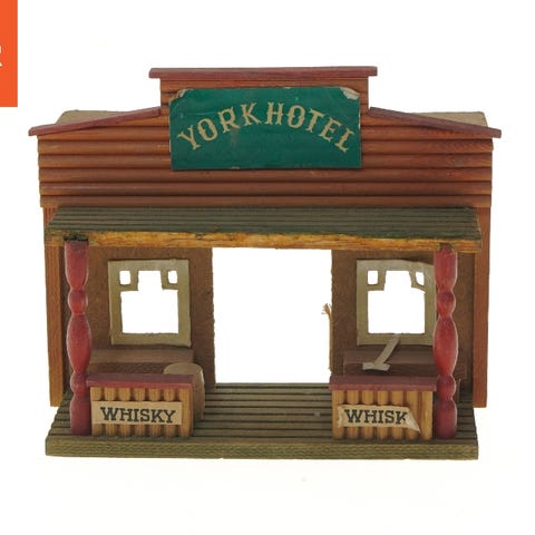 Denne miniaturemodel forestiller en sherifstation fra det vilde vesten med tekst 'County Jail' og 'Sheriff' på fronten. Den er lavet af træ eller trælignende materiale og har en grøn tag. Størrelsen er 20,5x13x14 cm.