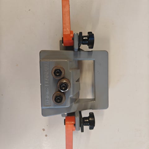 Boreskabelon til greb, justerbar model i grøn og grå plast. Anvendes som hjælpemiddel ved boring af huller til greb på fx skabe, skuffer og låger, så hullerne placeres ensartet. Skabelonen har skalainddeling og justerbare stop, der gør det muligt at indstille forskellige afstande mellem borehullerne. Velegnet til gør-det-selv-arbejde og montering af møbelgreb og håndtag i træ- og pladematerialer.