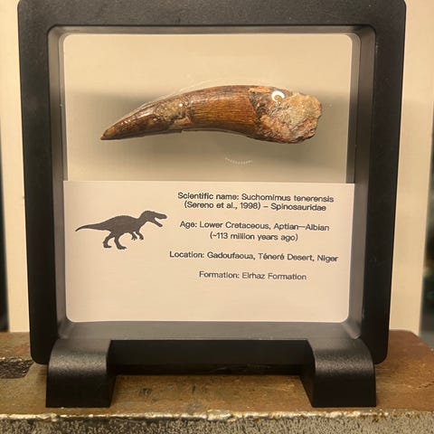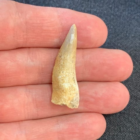 Stor tand med flot krone af en forhistorisk krokodille Elosuchus. Elosuchus havde en lang, smal snude – typisk til fiskediet – og kunne nå en kroplængde på op til ca. 7–7,7 meter