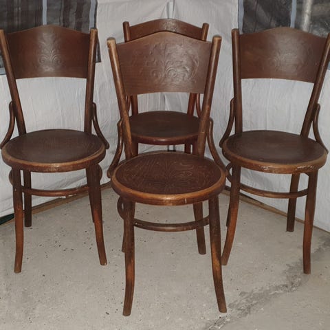 2 gamle Wienerstole, med flotte udskæringer i sæde og rygstykke.