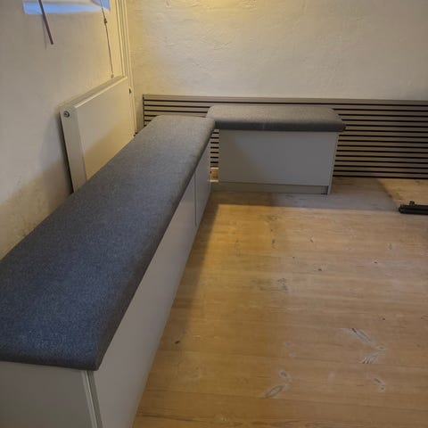 Bænken har nogle brugstegn (se billeder) og er heller ikke “perfekt” lavet, men kan nemt piftes op eller tilpasses - dog intet bemærkelsesværdigt. Står på sokkel. Har 5 gode skuffer med masser af plads til opbevaring. Måler 60 cm dyb og 266 cm lang. Hynden har aftageligt betræk som kan vaskes i vaskemaskine. Vi har en malingrest som kan medfølge hvis det ønskes.