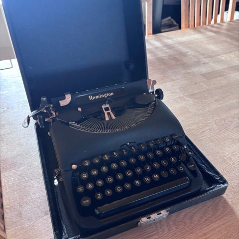 Rheinmetall skrivemaskine i sort metal med dansk tastatur (inklusive æ, ø og å). Mekanisk bærbar model monteret i tilhørende hård kuffert/transportkasse med håndtag. Velegnet til skrivning på løse ark og som funktionelt skriveværktøj eller som indretnings- og samlerobjekt. Maskinen har klassisk rundede taster og manuel vognføring med rulle til papirindføring.