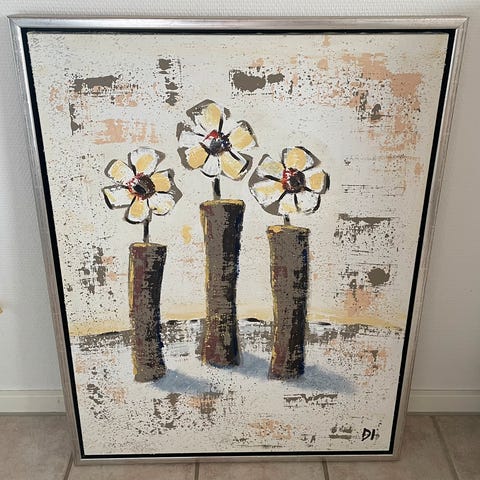 Meget smuk blomsterkomposition. Olie på lærred. Ingen synlig signatur men måske den er gemt under rammen. Eller også er der bare ingen. 55*67 cm. Du kan loppesjoppe det for 965 kr.