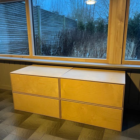 Kommoden består a fire Brick Box moduler fra Trævarefabrikernes Udsalg + en specialsyet madras fra Skumhuset i lækkert ternet uldstof.