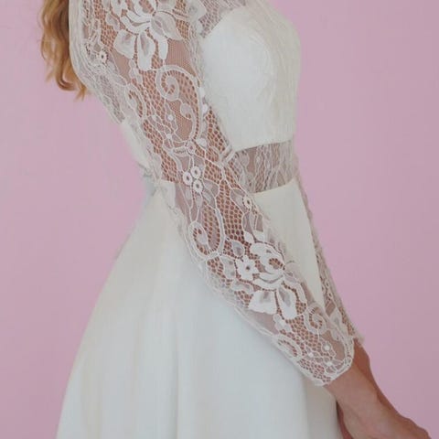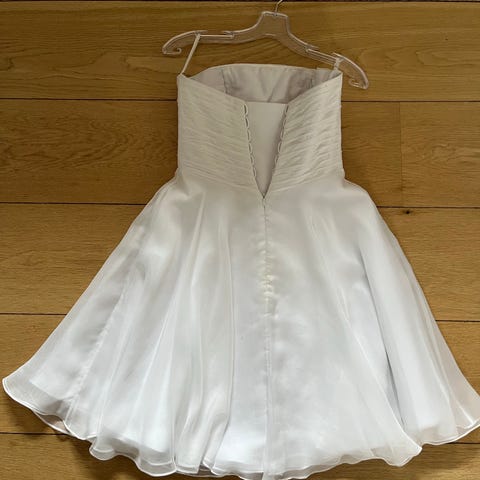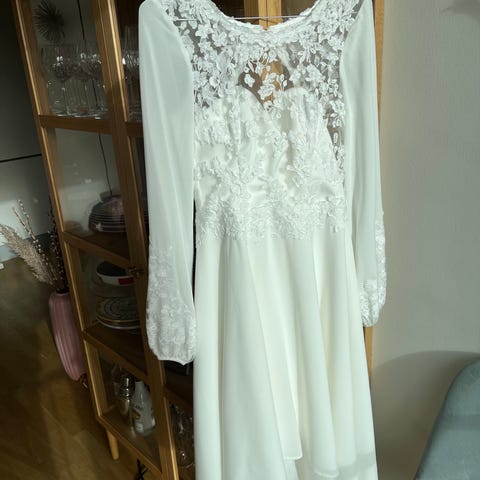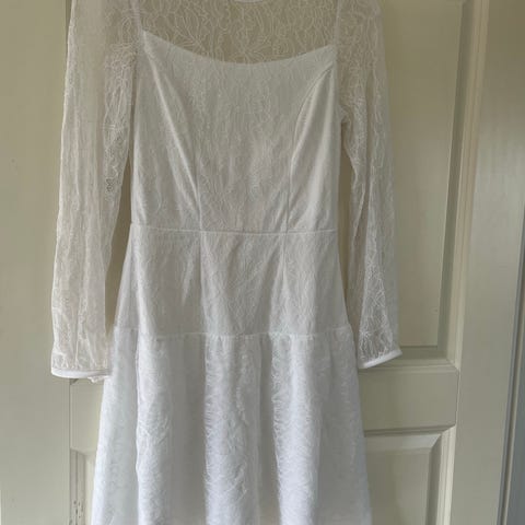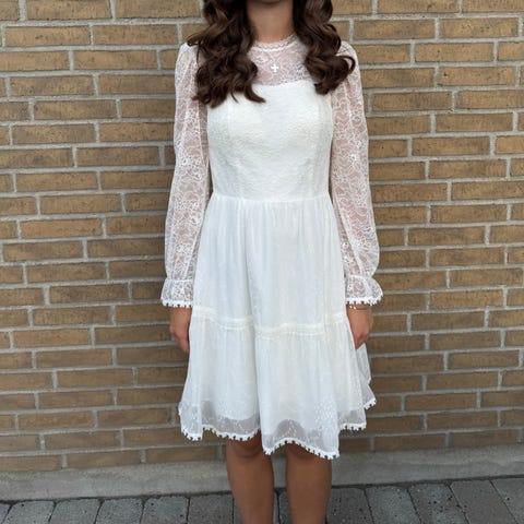 Holmenlund konfimationskjole til pige i hvid med lange ærmer og blondedetaljer. Kjolen har gennemsigtige ærmer med blondeapplikationer og blondetop med rund hals. Ryggen er designet med snøre- og båndlukning, som giver mulighed for justering af pasformen. Nederdelen er enkel og glat med let A-facon. Leveres med Holmenlund-kjolepose, som ses på billederne. Størrelse 34