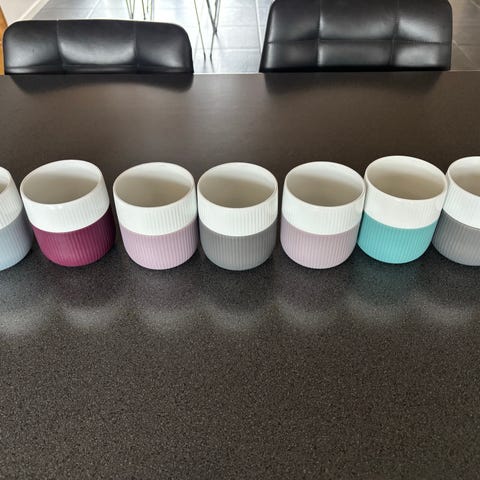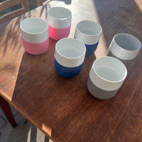 Royal Copenhagen termokrus i porcelæn med farvet yderside og rillet struktur. Krusene har hvid inderside og øverste kant, mens den nederste del er i forskellige farver. Velegnet til varme og kolde drikke i køkken og spisestue. Designet uden hank med dobbeltvægget funktion, så kruset er behageligt at holde om. Sælges 6 stk. samlet i blandet farver.