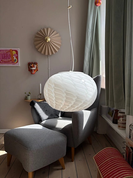 Loftslampen er mundblæst i en rund form med blåt og hvidt mønster. Da lampen er håndlavet kan der være små unikke forskelle for lampe til lampe.