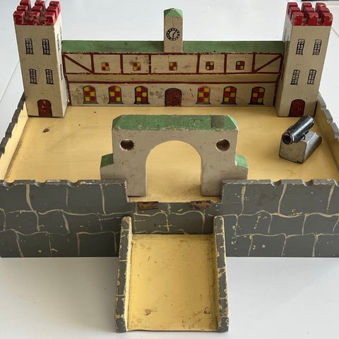Legetøj, Fængselslegetøj: Farverig sammenklappelig borg., Fæstning, håndlavet af indsatte i danske fængsler og solgt gennem Dansk Legetøjsfabrik. Har varenr. 38 i deres prisliste fra 1933. I god stand med almindeligt forekommende malingspatina.