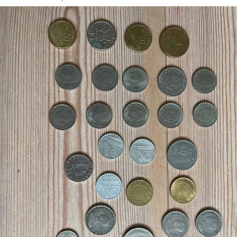 En kasse med to poser mønttutter. Aner ik hvor mange der er. De er forskellige og der er mange.