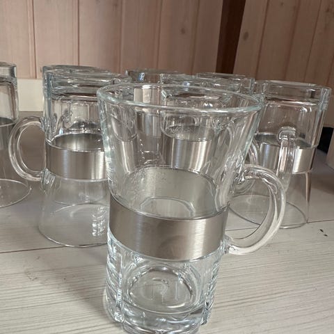 12 stk Rosendahl glas krus i gennemsigtigt glas. Krusene har hank og en enkel dekoration med en sølvfarvet stribe øverst. Velegnet til servering af varme eller kolde drikke ved borddækning i køkken eller spisestue. HENTES I BALLERUP