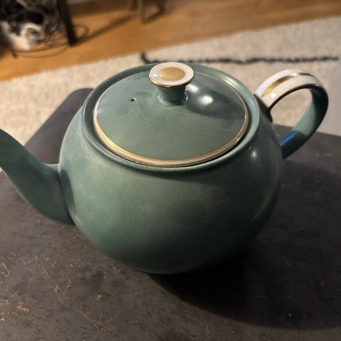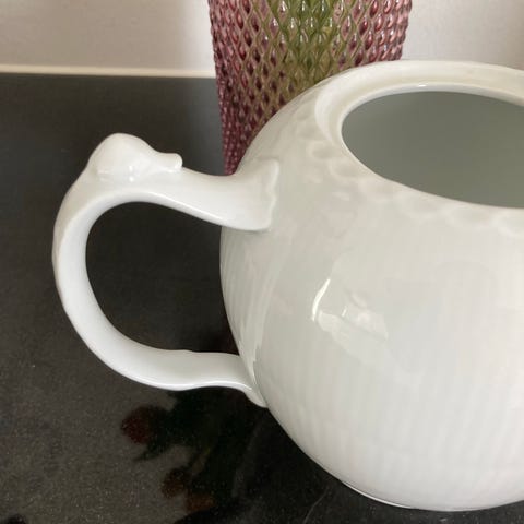 Royal Copenhagen hvid halvblonde thekande i hvidt porcelæn uden låg. Klassisk rund form med hank og hældetud. Egnet til servering af the ved borddækning i køkken og spisestue. Passer flot til Royal Copenhagens andre stel. Fejler ikke noget mangler bare låg. Kan også bruges til en buket blomster.