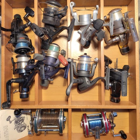 1 pirk 20 pund. 1 pirk 30 pund. 1 ny pirk 50 pund. 7 spindestænger. et transportrør. 8 power bait. 6 trout bait. 1 opbevarings net. 1 fangst net. 2 stang holder. 1 stang holder til kutter. 1 lille taske. 1 mellem taske. 1 stor kasse. 1 lille kasse. et ambassadeur 7000 grøn med flet. et shimano tld 15 med flet. et shimano 4000 2 spoler med flet/nylon. shimano 2500 2 spoler med flet/nylon. shimano 1000 2 spoler med flet/nylon. abu garcia cardinal med nylon. daiwa 2600 med nylon. en hjultaske. en hjul pose. en line alarm. 14 div bokse med bla grej. en line 0.60 23.3 kg. en flet line 0.18-18.1 kg. en kniv sliber. en fiske vægt. en lille saks. en fiske vægt digital. 2 knive. et par fiske briller. 2 transport ringe. en fiske hammer. en æske med div fluer. 3 tænger. 2 clips med træk line til saks/eller negleklipper. og så er der en betydelig mængde pirke kroge. og spinde kroge. og hvad der ellers behøves til fiske turen. HENTES I BALLERUP. SÆLGES KUN SAMLET