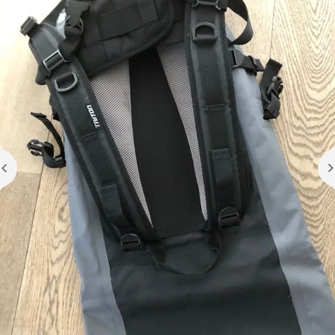 Motocentric rygsæk i sort. Tasken har hårdt, formstøbt ydre og polstret bagside. Forsiden er udstyret med elastiksnøre til fastgørelse af ekstra udstyr. Indvendigt er der hovedrum med stropper til fastspænding af indholdet. Medfølgende remme og tilbehør til fastgørelse, samt regnslag. Har en lille fejl i lynlåsen, men kan stadig lukke. Velegnet som rygsæk til motorcykel eller fastgørelse på motorcyklen.