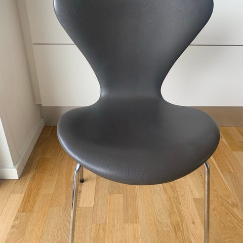 7 stk. Fritz Hansen Arne Jacobsen 7’er stol i sort læder med ben i krom. Klassisk skalstol med buet ryglæn og polstret sæde, velegnet til spisebord eller mødelokale. Designet af Arne Jacobsen for Fritz Hansen. Sælges som vist på billederne. En af stolene har en malerplet som formodentligt kan fjernes på rette vis.